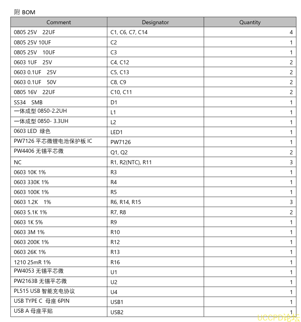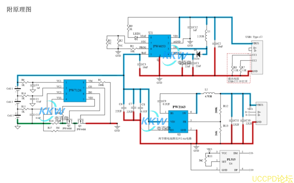 1 、 PW4053 - 锂电池充电管理芯片, 内置 MOS , 可输出 12.6V 1A 的充电电流。 支持 5V 输入