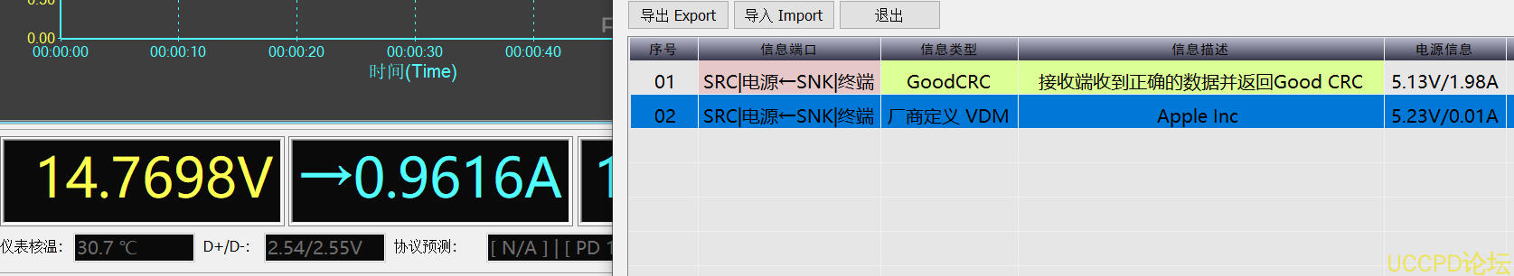 我们还连接了USB PD分析仪,企图能看下苹果的14.5V快充是如何通讯协议的,及其通讯的过程。结果如下: