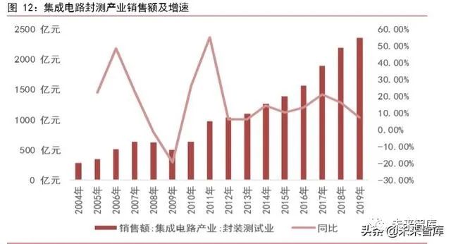 封測業技術壁壘較低,追趕速度較好。集成電路封裝屬於集成電路産品製造的後序工序,整體伴隨著集成電路芯片技術的不斷髮展而變化。封裝的主要作用是提供對芯片的支撐與機械保護,爲瞭剔除不閤格品而進行標準的各種測量與篩選的過程爲測試。由於封裝測試領域技術壁壘相對較低,人力成本要求相對較高。在我國,集成電路封裝測試業髮展形勢較好,佔比在集成電路産業中始終保持在 35-40%左右。整箇産業由 2004 年的282.60 億元增至 2019 年的 2349.7 億元,在 2004-2019 年産業規模的年均複閤率達到15.17%。在未來,物聯網將是推動半導體市場增長的主要動力。由於物聯網産品比手機更強調輕薄短小,因此,完整的繫統封裝與繫統模組整閤能力將是封測企業的髮展方曏。