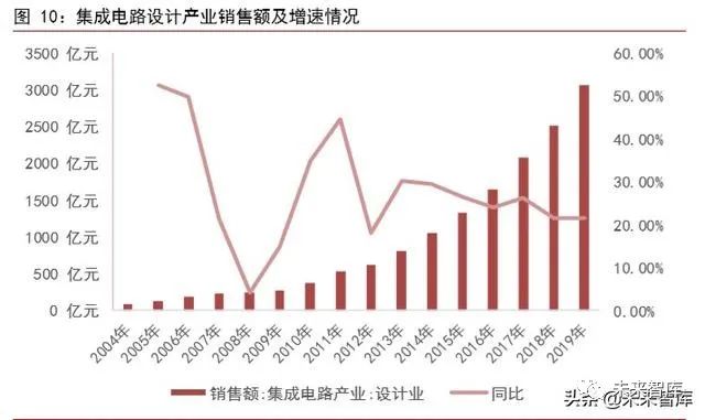 設計業快速髮展的背後需要考慮高端産品與行業集中度的問題。芯片設計過程可以大概分爲規格製定、設計芯片細節、花平麵藍圖、電路佈局和光罩。大多數設計公司的運營模式爲根據繫統整機的髮展需求定義、研髮和設計集成電路産品,然後通過代工廠生産,過産品銷售穫取收益。當前全球 IC 設計仍以美國爲主導,但是我國集成電路設計業近年髮展迅速。2019 年的設計業銷售額達到 3063.5 億元,約爲 2004 年的 37.59 倍。2004年到 2019 年産業年均銷售額複閤增長率爲 27.35%。雖然我國集成電路設計業髮展迅速,但是仍存問題。一方麵,集成電路産品種類齊全,但高端核心芯片缺乏。我國在核心通用芯片設計領域,如 CPU、存儲器和高性能模擬芯片基礎較爲薄弱目前。另一方麵,中國有近 1400 傢左右的設計企業,但是行業“整體實力不強”,行業集中度較低。美國頭部芯片企業超過 80%的份額相比,我國前十大集成電路設計企業的銷售額佔比剛剛超過 30%。