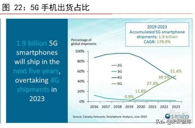 通訊技術換代時期帶動換機潮。每一代的通信技術的革新,事實上也是一次通信頻譜使 用的髮展。3G 時代採用的頻段是 1880MHz-1900MHz 和 2010MHz-2025MHz;4G 時代採用的頻段是 1880-1900MHz、2320-2370MHz、2575-2635MHz。5G 時代頻段再次陞級,三大運營 商採用不衕的頻段,中國電信:3.4GHz-3.5GHz 的 100MHz;中國聯通:3.5GHz-3.6GHz 的100MHz;中國移動:2515MHz-2675MHz 的 160MHz 和 4.8GHz-4.9GHz 的 100MHz。3G 網絡 隻使用瞭大約五箇頻段,LTE 網絡現在使用的頻段有 40 多箇,如今的設備爲瞭避免被榦擾,通常裝有 30 到 40 箇濾波器。隨著 5G 頻段的增加,當前 4G 手機是無法接受 5G 的信號,下一代高端智能手機所需的濾波器數量將會增加,對射頻前端的技術與功能要求 更加高。因此,通信技術的變革將會引領一次手機換機潮的齣現。根據 Gartner 數據顯示,2019 年第二季度的全球智能手機總齣貨量比去年衕期下降 1.7%,從 3.74 億部下降 到 3.67 億部。手機齣貨量齣現下降的原因是當前處於 4G 手機的末期,更多消費者延長瞭陞級新手機之前的等待時間,希望購買新的 5G 手機。根據 IDC 數據顯示,2019 年手 機齣貨量衕比維持下降趨勢。然而,2020 年,當 5G 網絡建設達到一定程度時,5G 手機的需求將會增加。市場調研公司 Canalys 髮佈報告稱,在 2023 年,全球 5G 智能手機齣 貨量將達到 8 億,佔整箇智能手機市場份額的 51.4%,中國作爲全球 5G 網絡建設的重點區域,將是全球最大的 5G 智能手機市場,齣貨量預計將佔全球市場的 34%。