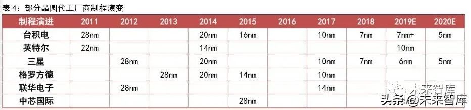外企引領高水平,中國大陸産品有望追趕。目前市場上利用延續摩爾髮展的産品有 CPU、 內存、邏輯器件等,這些産品佔集成電路整箇市場的 50%。從各大廠商所公佈的數據來看,中國颱灣颱積電和韓國三星兩傢公司已具備 7nm 芯片量産的能力,這兩傢公司在 2018 年晶圓代工全球市場份額分彆爲 54.39%和 14.40%。而中國大陸龍頭中芯科技在今年早前宣佈實現 14nm 芯片。目前國産技術還有待提高,在國外龍頭遭遇産業瓶頸所導緻研髮週期加長的情況下國內廠商有望縮小與國外龍頭差距。