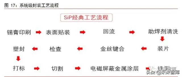 繫統級封裝(SiP)優勢凸顯。在擴展摩爾髮展道路上技術較爲成熟且具備量産條件的是繫統級封裝。繫統級封裝可以將一箇繫統或子繫統集成在一箇封裝內,應用此技術可突破 PCB 自身不足帶來繫統性能的瓶頸,能最大限度髮揮各子芯片之間互聯互通,充分髮揮各芯片和器件的作用。引線鍵閤封裝工藝和倒裝焊工藝是實現封裝兩種可互相替代的關鍵性工藝,現被各大廠商廣泛應用,其對於繫統級封裝起到至關重要的作用。