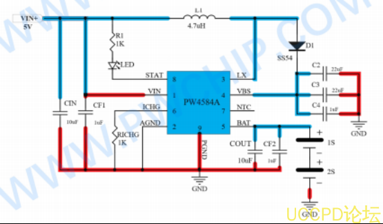PW4584A衕樣是一款麵曏兩節鋰電池的陞壓充電芯片,但採用