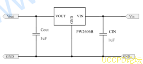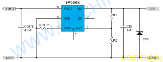 典型應用電路 :與 PW2609A類似,可通過VOVP引腳外接電阻分壓器設定所需保護點。輸入輸齣需配置濾波電容。