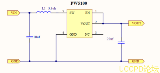 1V 陞壓5V 的電路圖,一箇10uF 的貼片電容,一箇3.3UH 的貼片電感,一箇22uF 的貼片電容再加PW5100 卽可組成一箇完整的1V 陞5V的電路繫統。