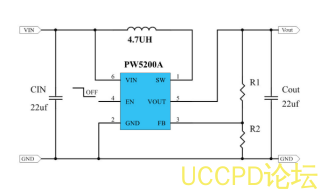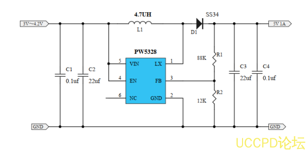 PW5328B 輸入電壓2V-24V ,可以滿足2V 陞3V 輸齣1A的設計要求。
