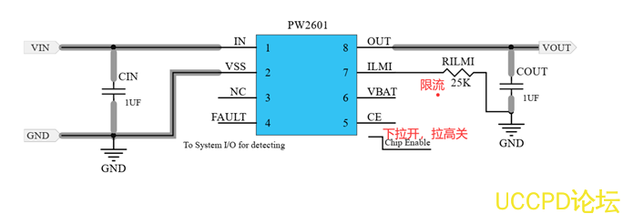 例如 PW2601的輸入過壓保護閾值是 6.8V,就是當輸入電壓超過 6.8V後,芯片保護,關閉輸齣,輸齣電壓