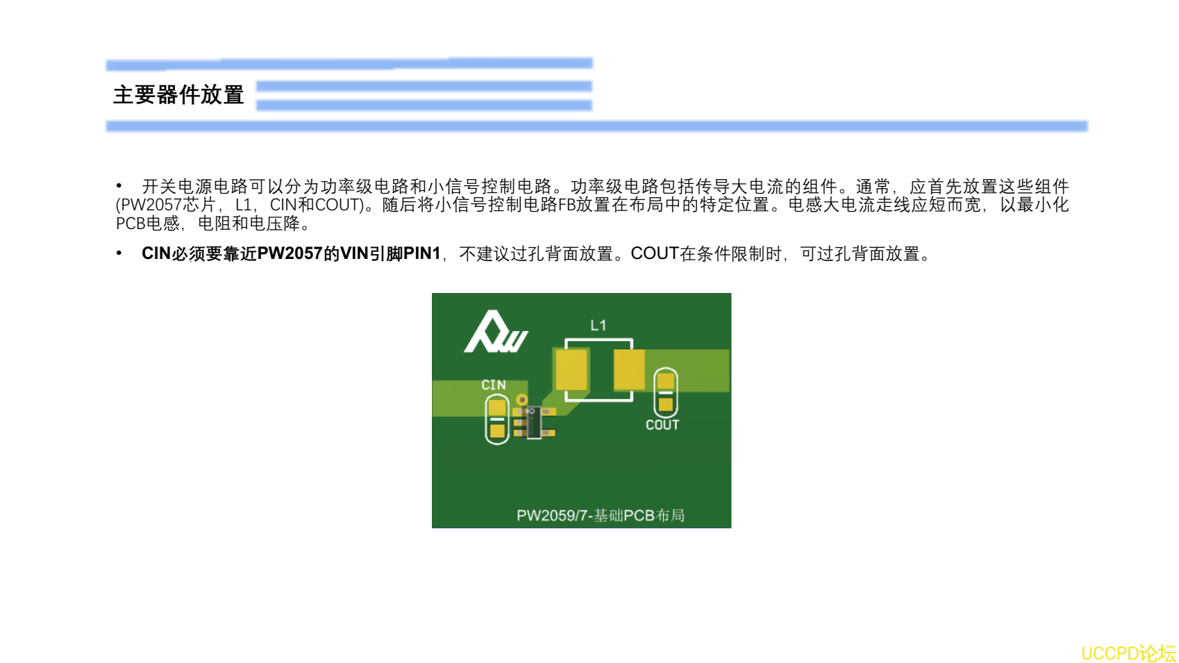 (PW2057芯片, L1, CIN和COUT)。 隨後將小信號控製電路FB放置在佈局中的特定位置。 電感大電流走線應短而寬, 以最小化