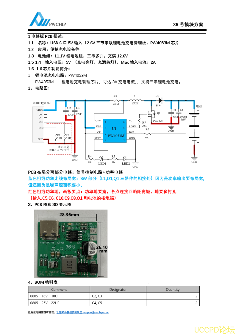 1.1 名稱: USB C 口 5V 輸入, 12.6V 三節串聯鋰電池充電管理闆, PW4053M 芯片