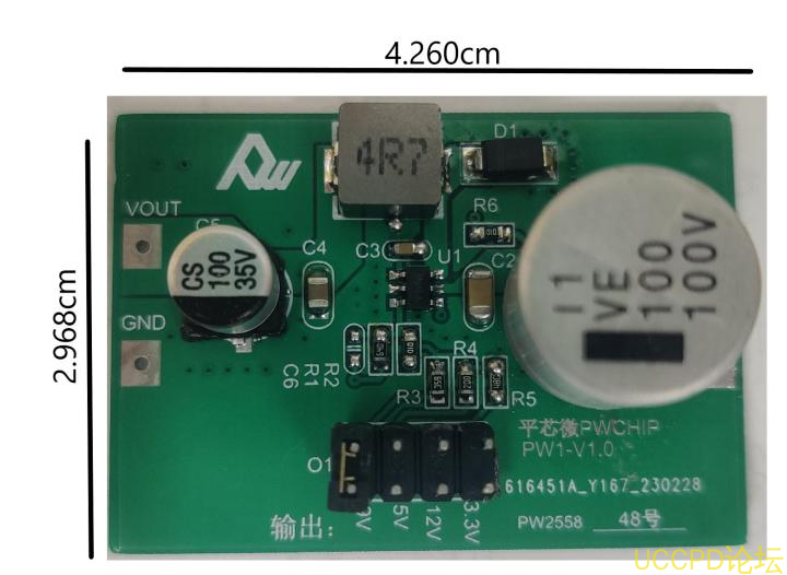 此電路闆的核心組件是一款名爲 PW2558 的降壓芯片,牠可以實現輸入電壓的降壓,併提