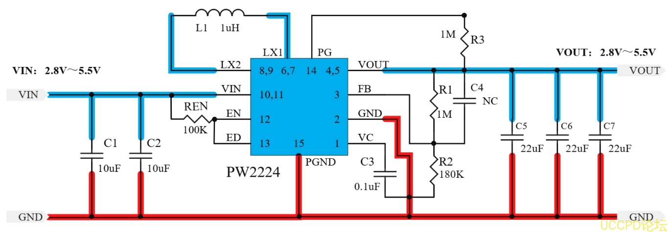 PW2224 輸入電壓 2.8V~ 5.5V, 可通過 R1,R2 設置恆壓輸齣電壓值, 電流可高達 3A(降壓模式時 3A, 陞