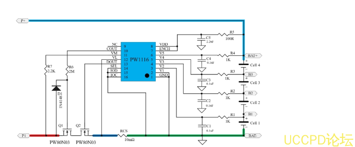 PW1116 四串鋰電池得過充,過放,過流檢測保護電路芯片,併聯 MOS 可增加過流保護值。