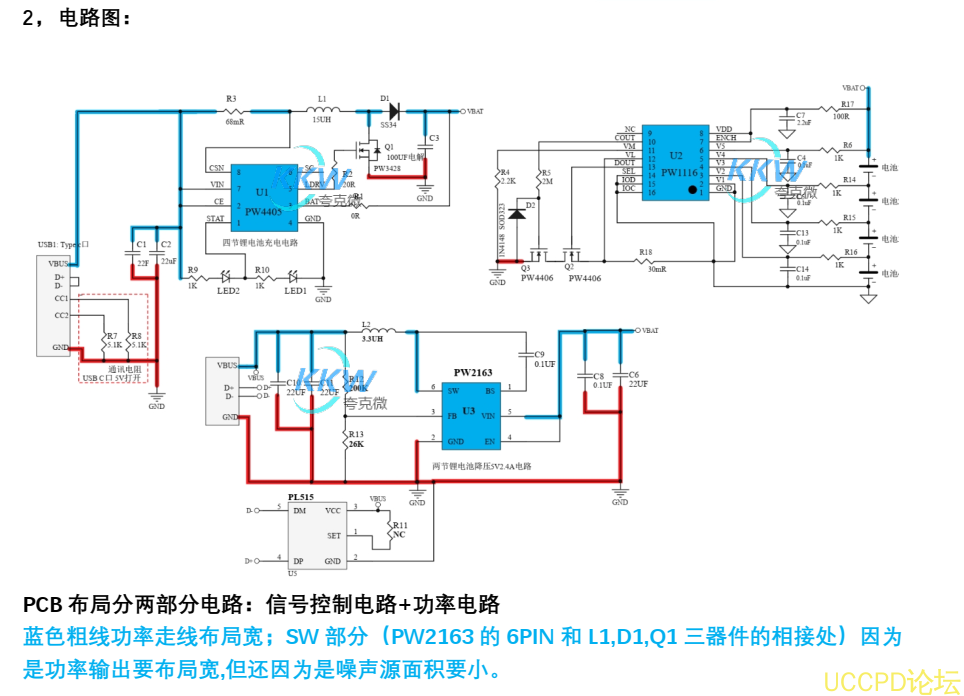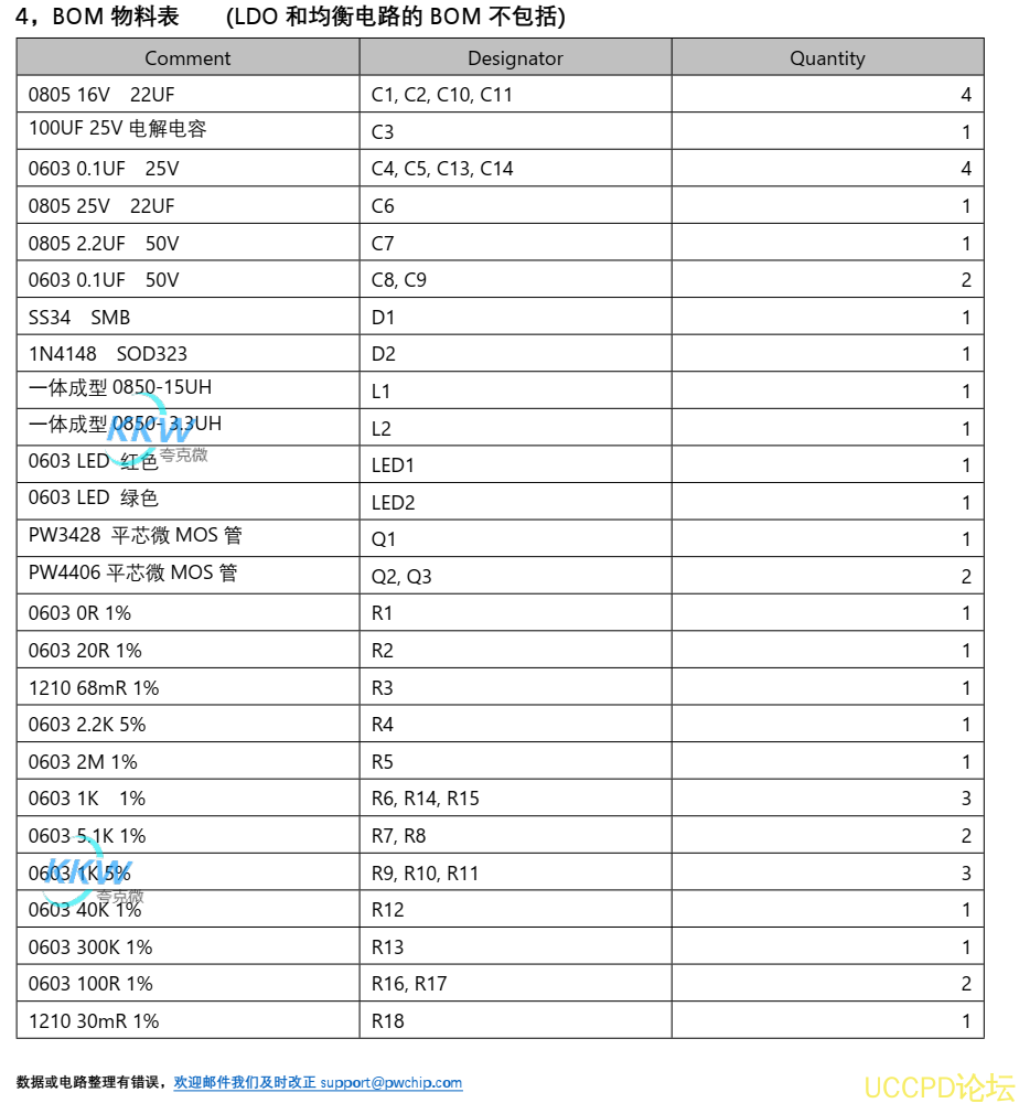 PW4405 鋰電池充電管理芯片, 外置 MOS, 可達 2A 充電電流, 5V 陞壓四串鋰電池充電。