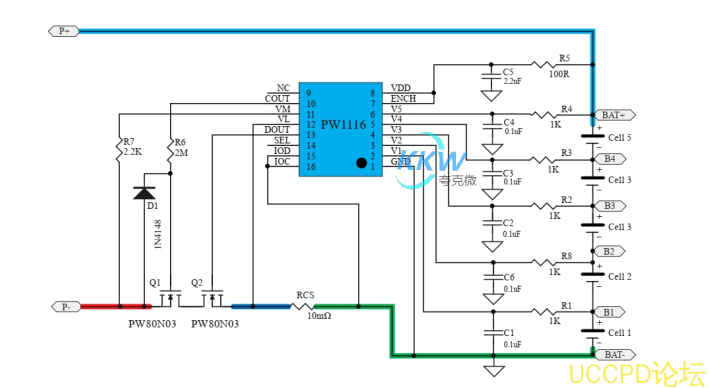 PW1116 五串鋰電池得過充,過放,過流檢測保護電路芯片,併聯 MOS 可增加過流保護值。