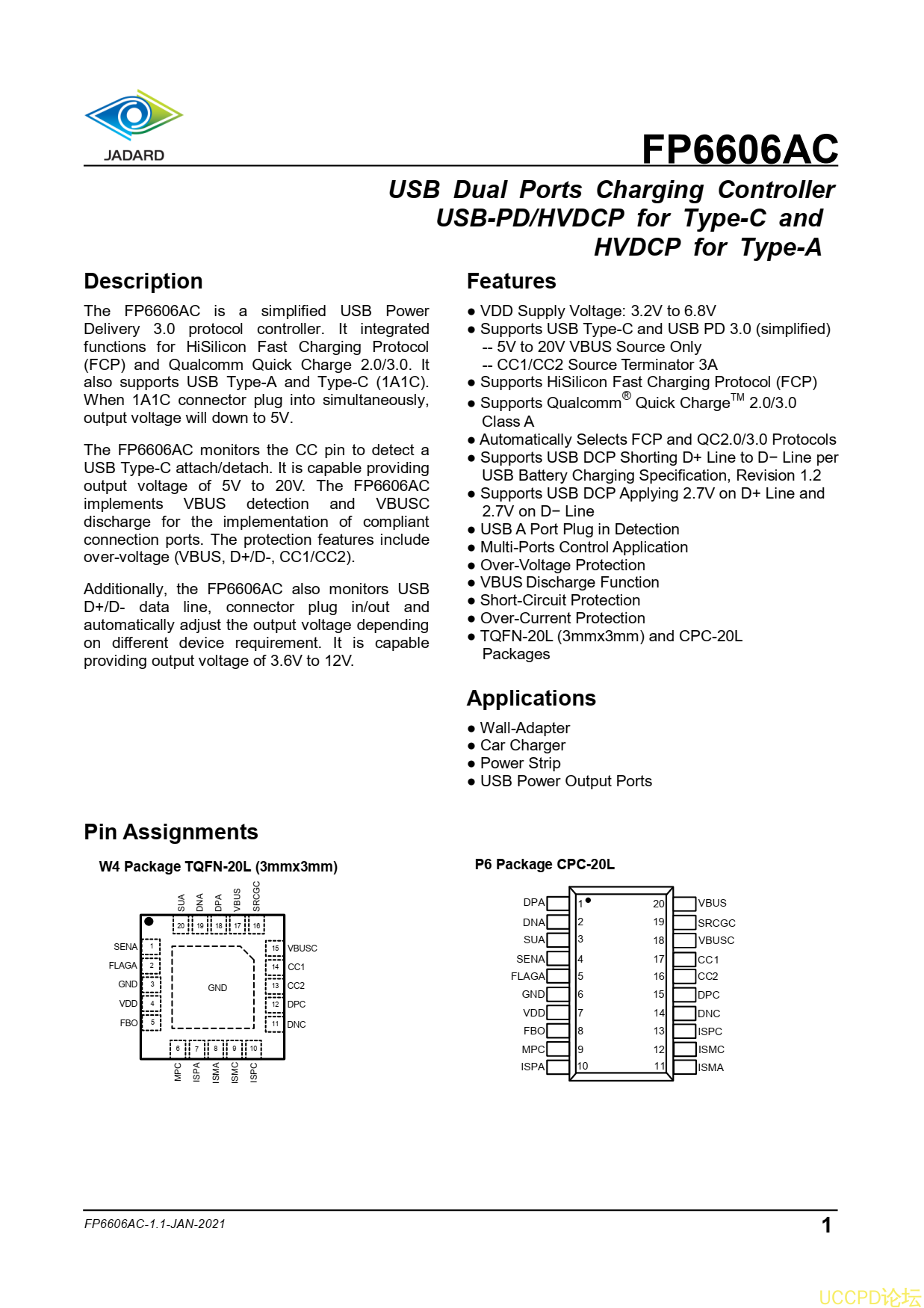 FP6606AC是一種簡化的USB電源交付3.0協議控製器。牠集成瞭海思快速充電協議的功能(FCP)和高通公司Quick Charge 2.0/3.0也支持USB Type-A和Type-C(1A1C)。