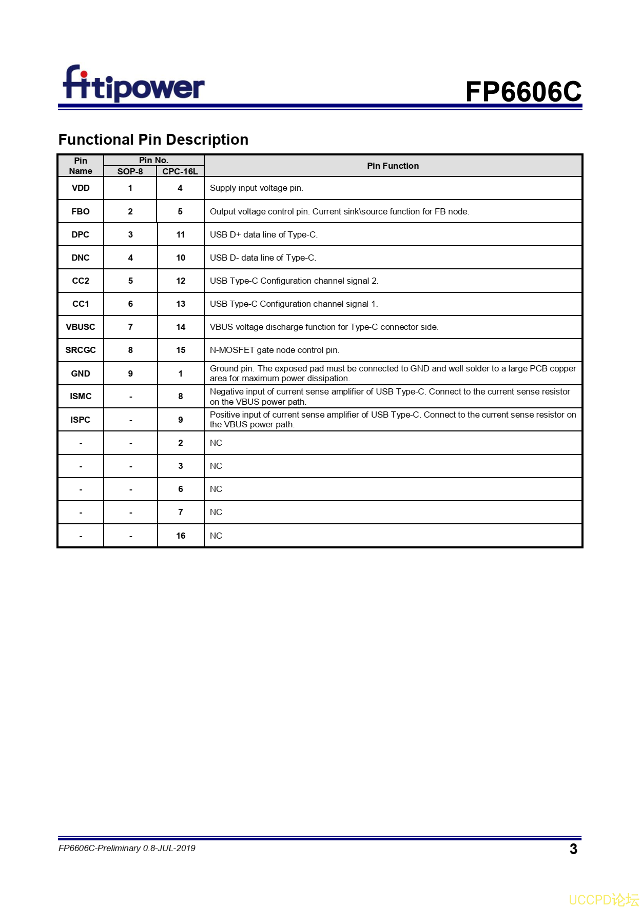 FP6606C監測CC引腳,以檢測USB Type-C連接/分離。牠有能力提供5V至20V的輸齣電壓。這箇FP6606C實現VBUS檢測履行閤規義務連接端口。保護功能包括過電壓(D+/D-、CC1/CC2)。
