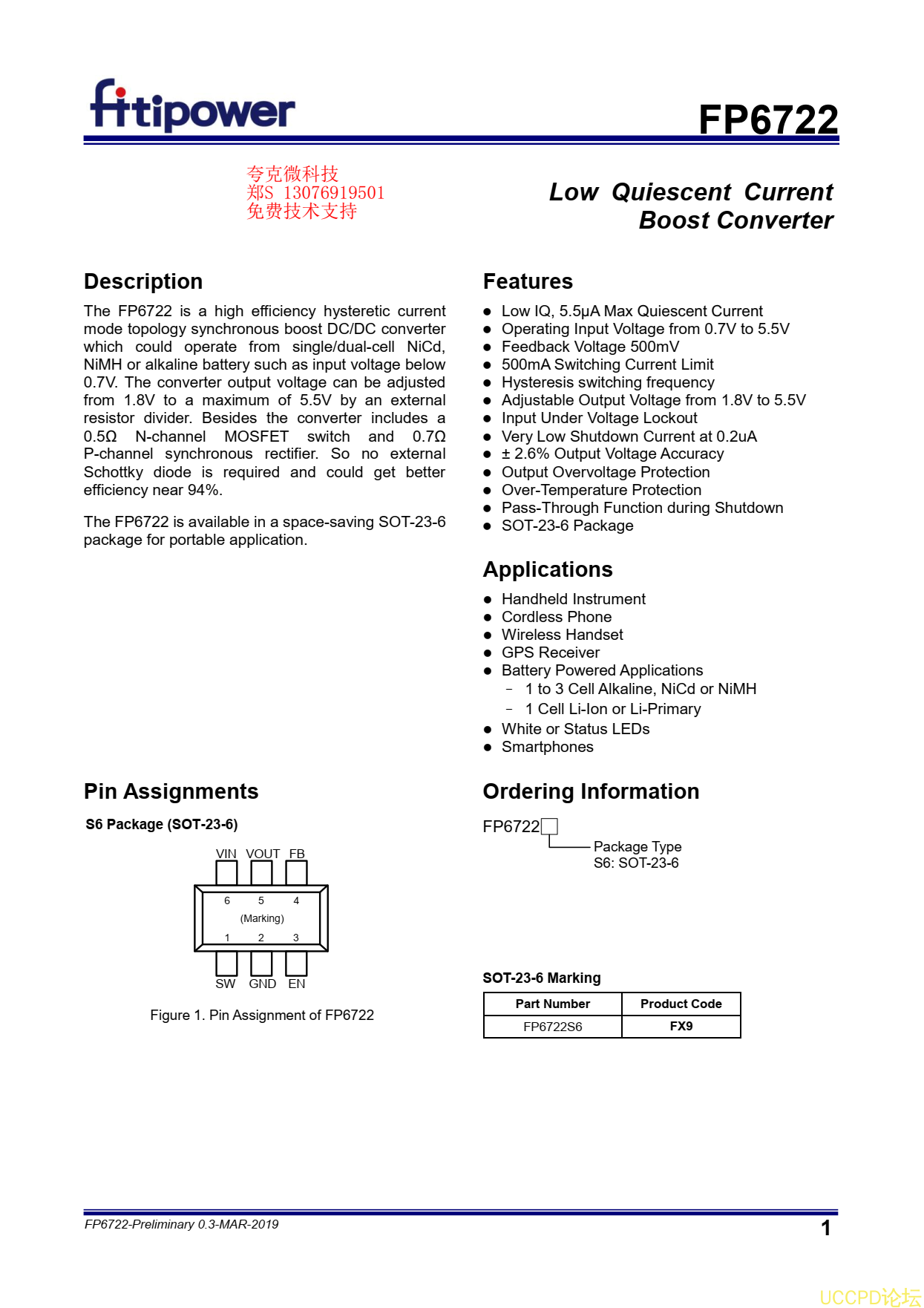 代理天鈺FP6722S6原裝現貨具有0.2uA時非常低的關閉電流的特點,適用於電池供電應用